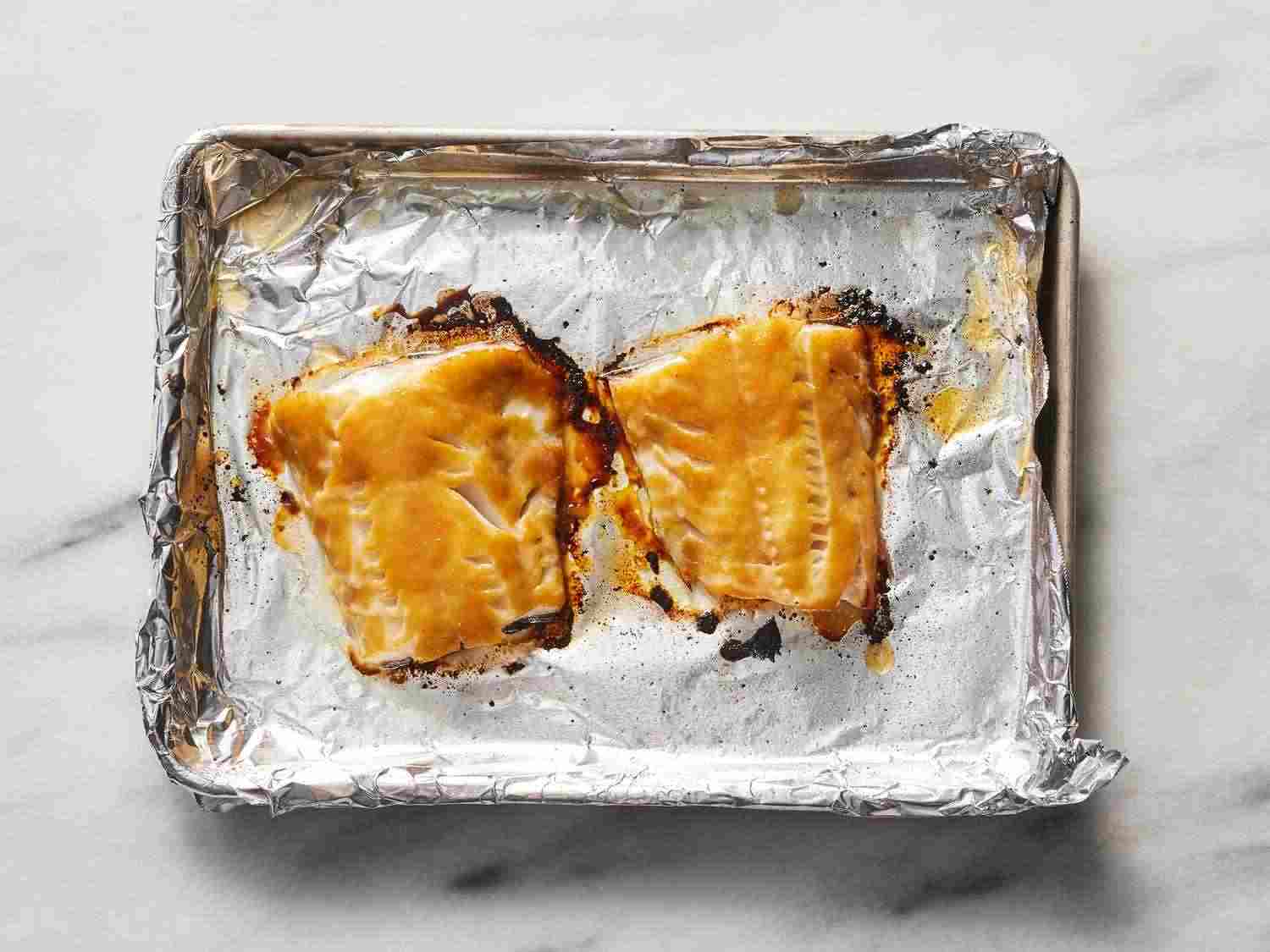 - Step 5:Broil in the preheated oven for 5 minutes. Turn the baking sheet 180 degrees and continue broiling until fish flakes easily with a fork, about 5 minutes more. Remove pin bones before serving. Dotdash Meredith Food Studios
